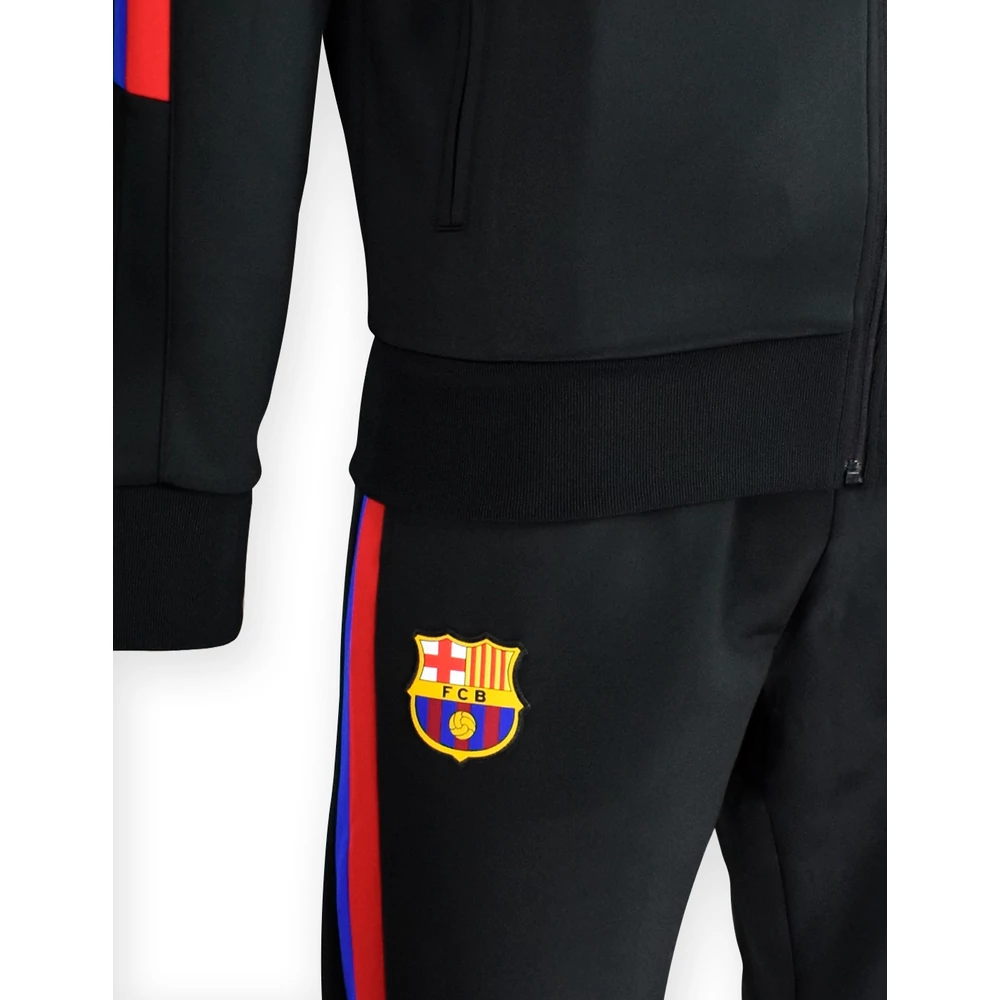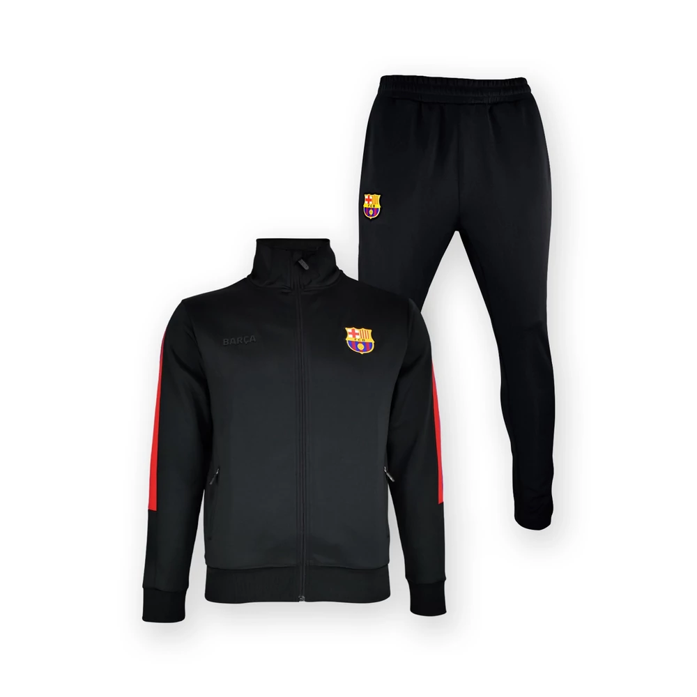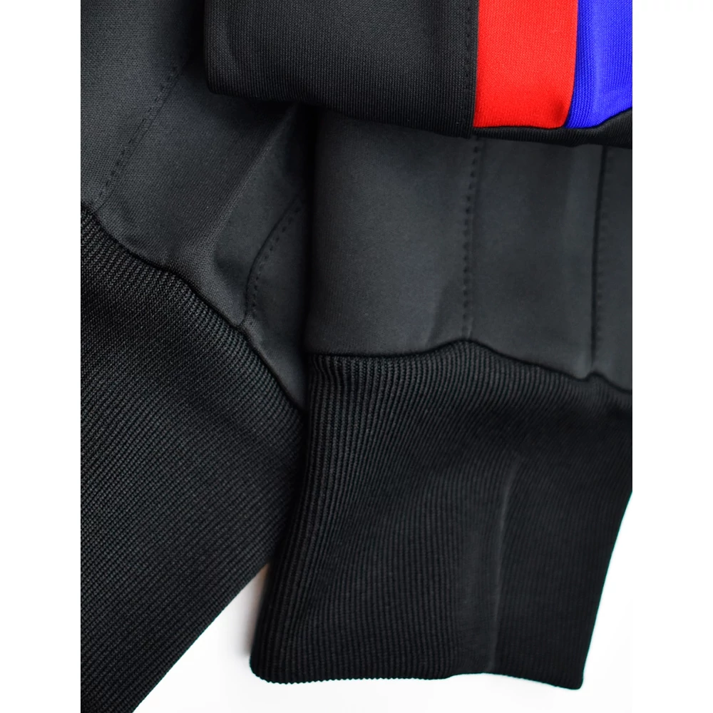 Mindig népszerű, ha egy Barcelona szerelés fekete színt kap, és ez így van ezzel a melegítő szettel is - kifejezetten gyerekeknek. Látványos piros-kék színbetétek, a klub címere, és egy erős, tartós melegítő szerelés gyerekeknek. Fekete alapszín, a mellkason kék sáv, az ujjon a kék mellett egy gránátvörös díszítő csík is. Kényelmes, ruganyos, javarészt poliészter alapanyag, mely ideális sporthoz, de kényelmes otthoni viselet is.