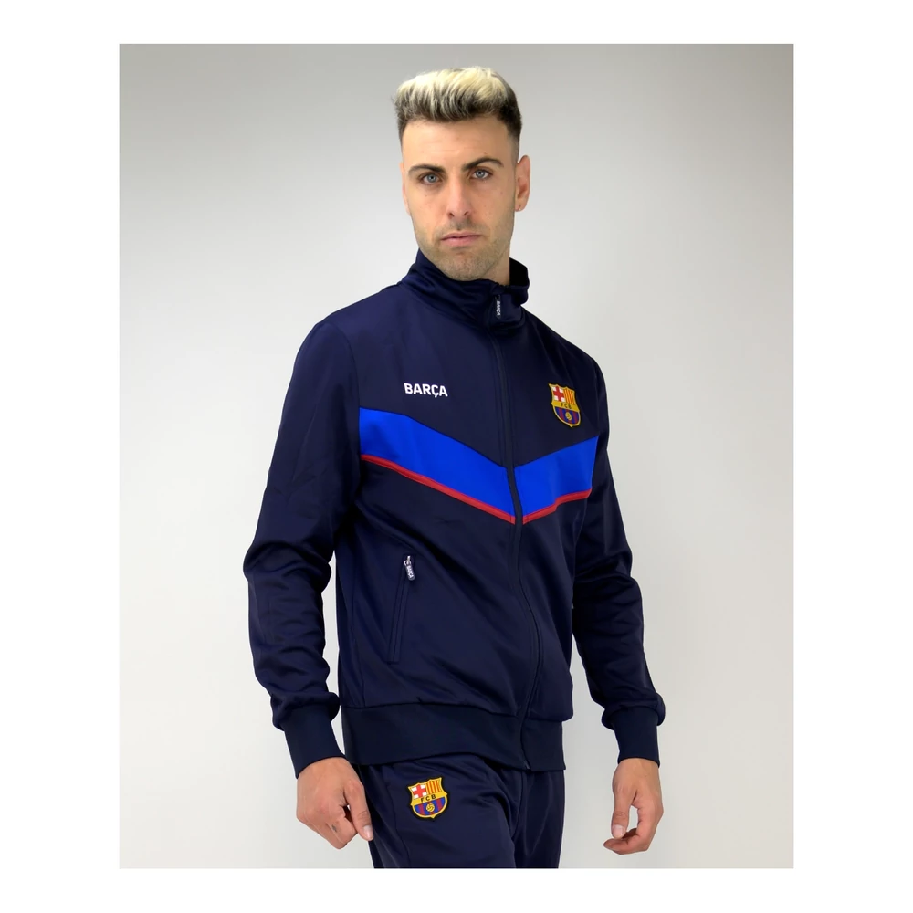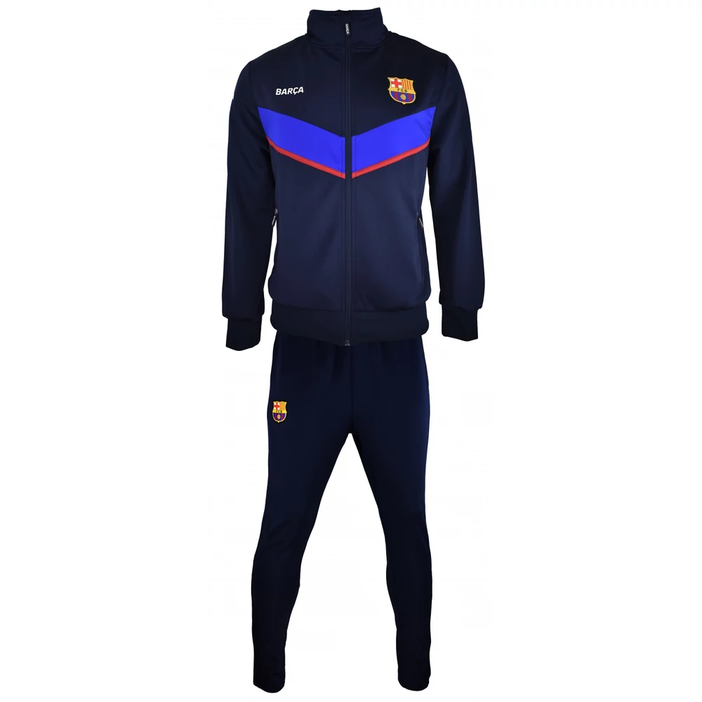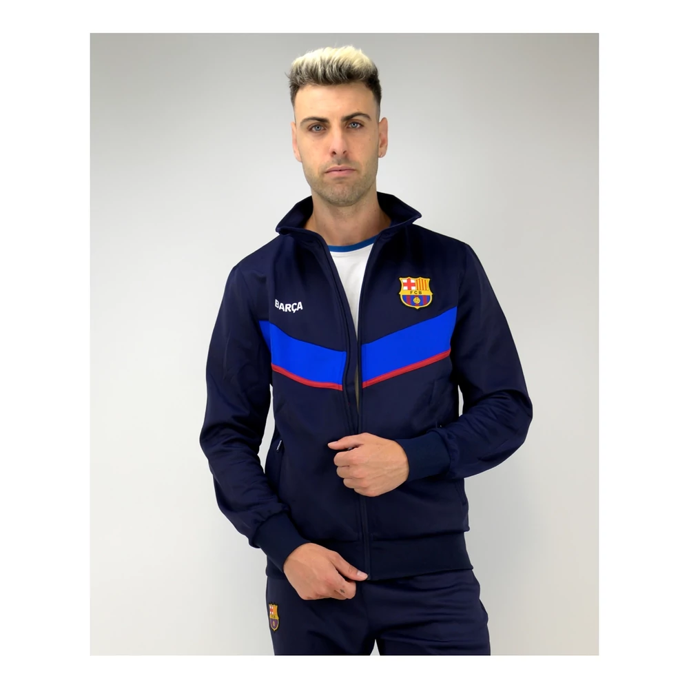 Sötétkék FC Barcelona melegítő szett a klub címerével, Barca felirattal, illetve piros-kék díszítő csíkokkal. Minimalista tervezés, nincsenek felesleges díszítőelemek, de a klub színei, és főleg a sötétkék uralják a melegítőt. A Barcelona címer a felsőn és a nadrágon egyaránt megjelenik, az anyag kényelmes és ruganyos, nagyrészt poliészter alapanyag, így sportoláshoz és hétköznapokra is ideális.