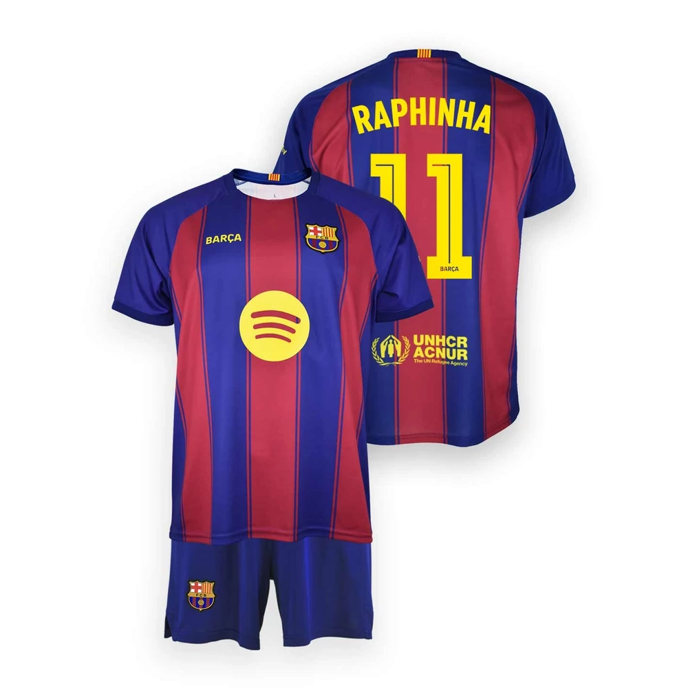 Prémium szurkolói FC Barcelona mez RAPHINHA - 11 feliratozással. Játsszon a kisfiad eredeti FC Barcelona szettben. Szerezd meg a Barcelona 2025-2026-os idényre készült első számú mezének szurkolói gyerek szerelését. Könnyű, jól lélegző, kiváló nedvesség elvezető tulajdonságokkal rendelkező termék. A gránátvörös és kék színben készült mez és short a klasszikus csapat színt jeleníti meg. Az elülső oldalán található a Barcelona címere, Barça felirat és a szponzor logója. Gyermeked kedvence lesz hosszú évekig!