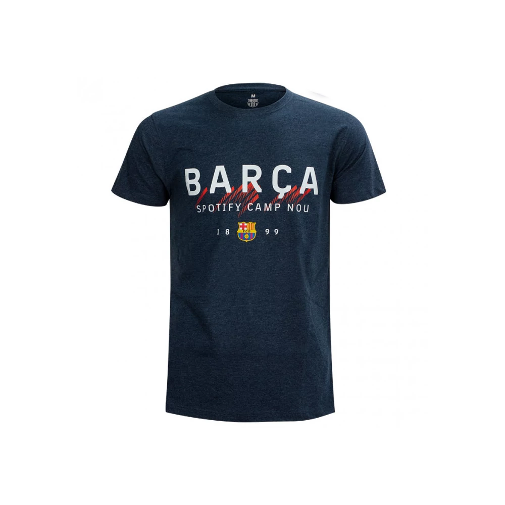 Kékes-szürke Barcelona gyerek póló, nagyobb Barça felirattal, kisebb címerrel és a Camp Nou új nevével. 100% pamut alapanyag, dinamikus design, gránátvörös díszítések, fehér felíratok.